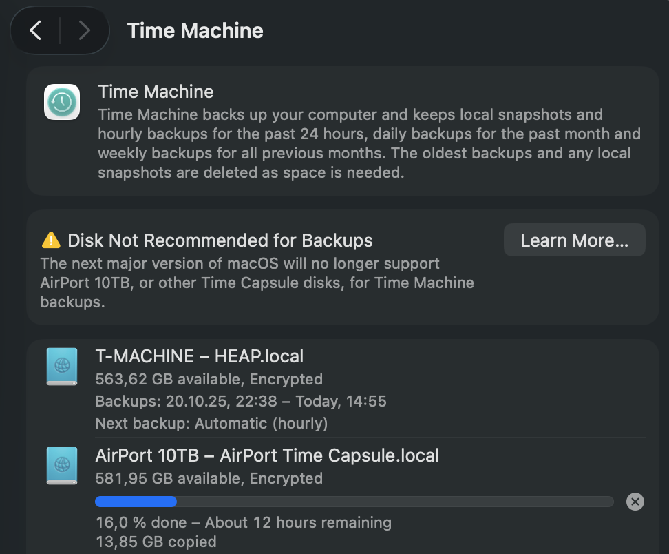 It’s a nostalgic reminder that even reliable Apple hardware eventually ages out of full support. My Time Capsule still spins and serves, but macOS has clearly signaled: time to move on to a modern backup strategy — like an SMB-capable NAS or an external drive formatted as APFS.